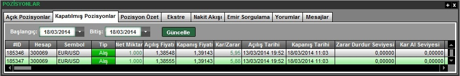 İlgili gün içerisinde kapatılmış pozisyonlara ait kayıtları bu ekranda izlenir. Pozisyon kapama daha önce açık bir pozisyonun kapatılması yönünde yapılan bir işlem olması nedeniyle kar/zararın kesinleştiği aşamadır. Bir posizyona karşılık başka bir pozisyonun açılması pozisyonun kapatıldığı anlamına gelmeyecektir, örneğin; EUR/USD Alış posizyonuna karşı EUR/USD satış işlemi yapıldığında bu işlem ‘Kapatılmış Pozisyonlar’ ekranında görünmeyecektir.